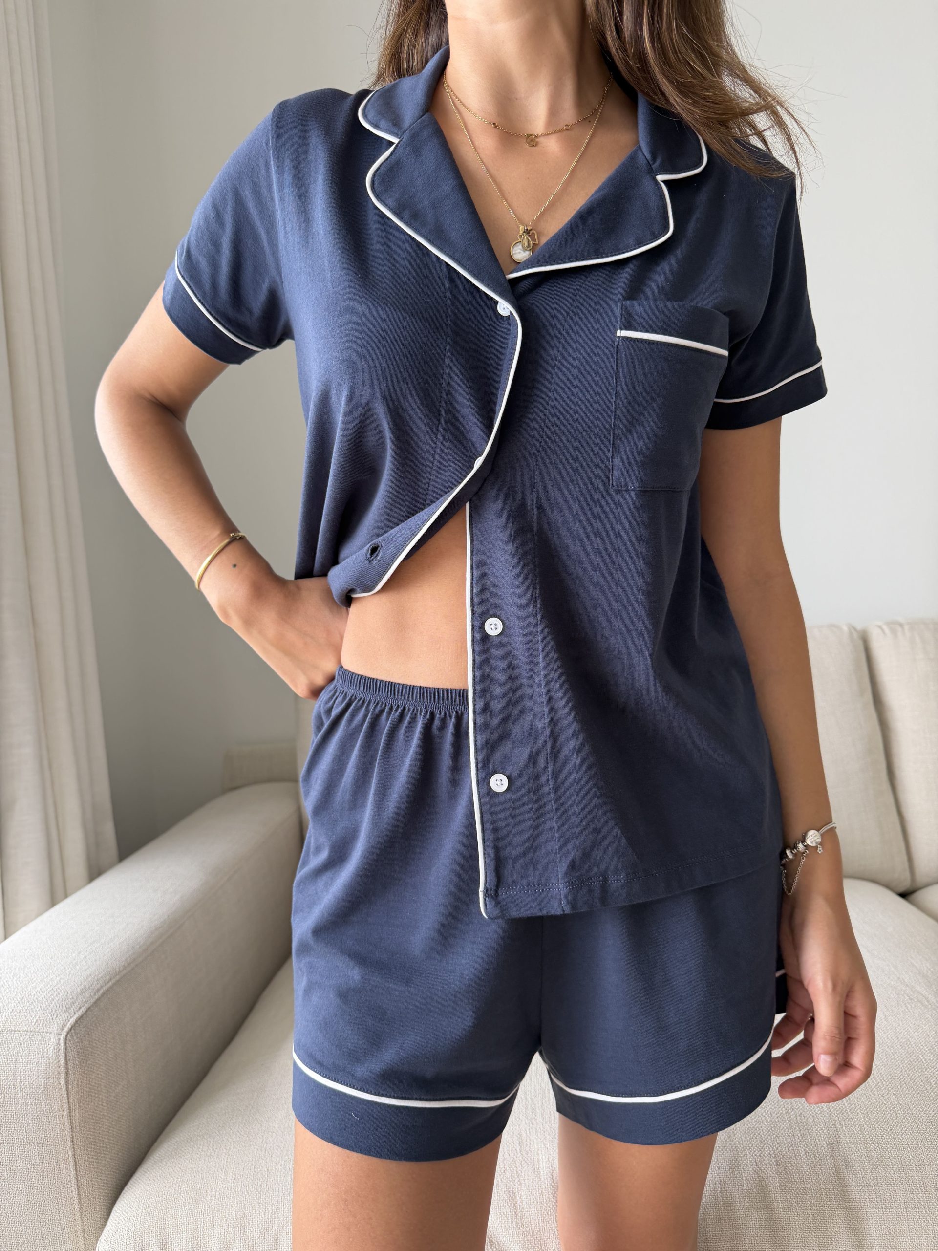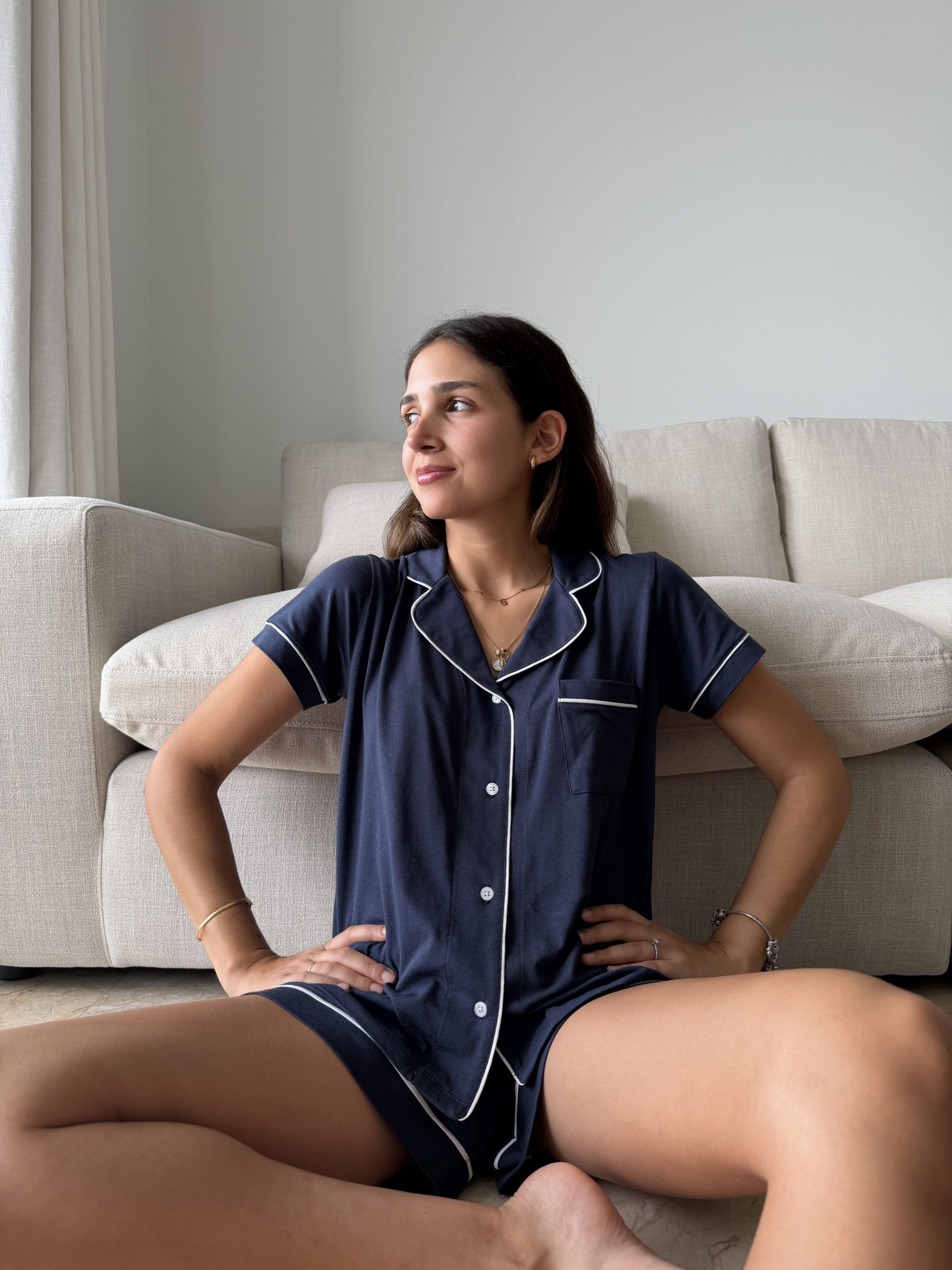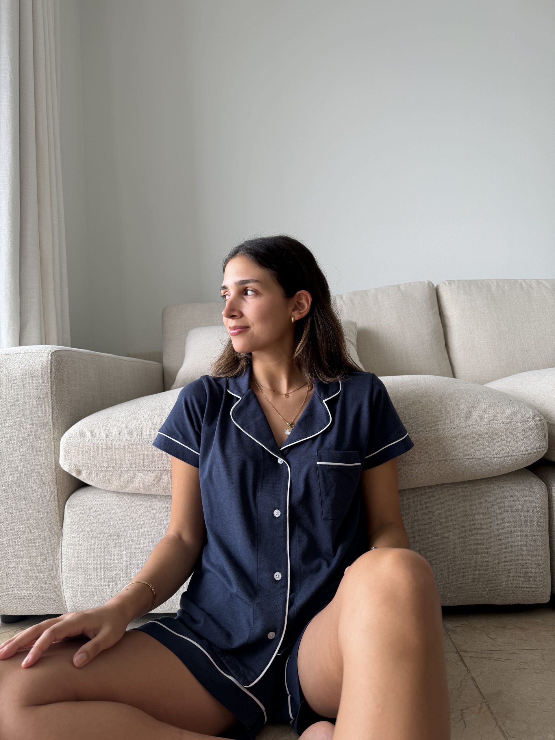 El favorito del verano, Sienna, ahora en un azul noche que invita a relajarte y disfrutar tus noches con frescura. Hecho de algodón Modal extra suave, con elástico suave y fit suelto para un descanso de lujo.
